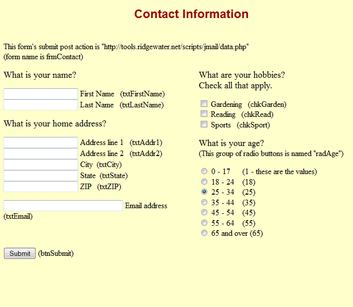 Lab Forms Do: Turn in two screenshots of the in class exercise we did together in class. The screenshots must show your name in it somewhere, the form, and the result of the form when it is fully filled out. Do: Create a submission form. Your posting action will be to the URL https://tools.ridgewater.net/scripts/jmail/data.php Here is a snapshot of the form and the form variable names. Also shown is the form action that is called upon submission. Note: Pay careful attention to the variable name case. Variable names are cAsE sEnSiTiVe. Build the web page containing the form. Once built and published, test your form. All input fields will be echoed back if your form is working correctly. That will be how you know if you did everything correctly. Zip up your form and submit it to D2L. Turn in two screenshots of your homework assignment. The screenshots must show your name in it somewhere, the form, and the result of the form when it is fully filled out.