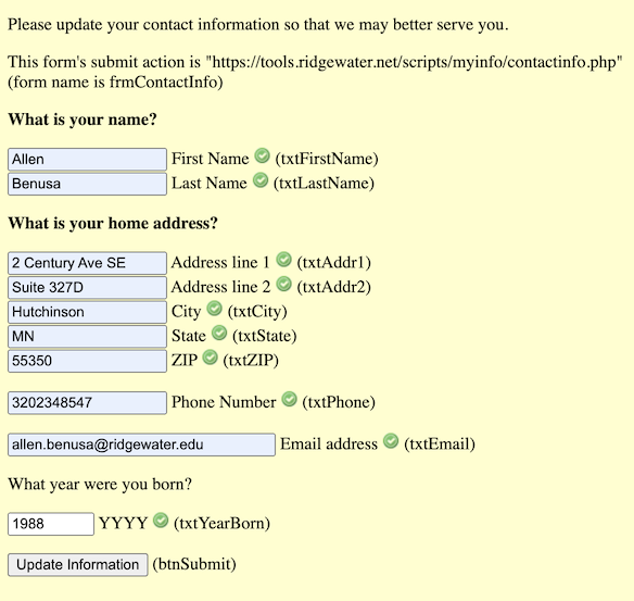 Create a contact information update form. Here is a snapshot of the form and the form variable names. Also shown is the form action that is called upon submission. Note: Pay careful attention to the variable name case. Variable names are cAsE sEnSiTiVe.